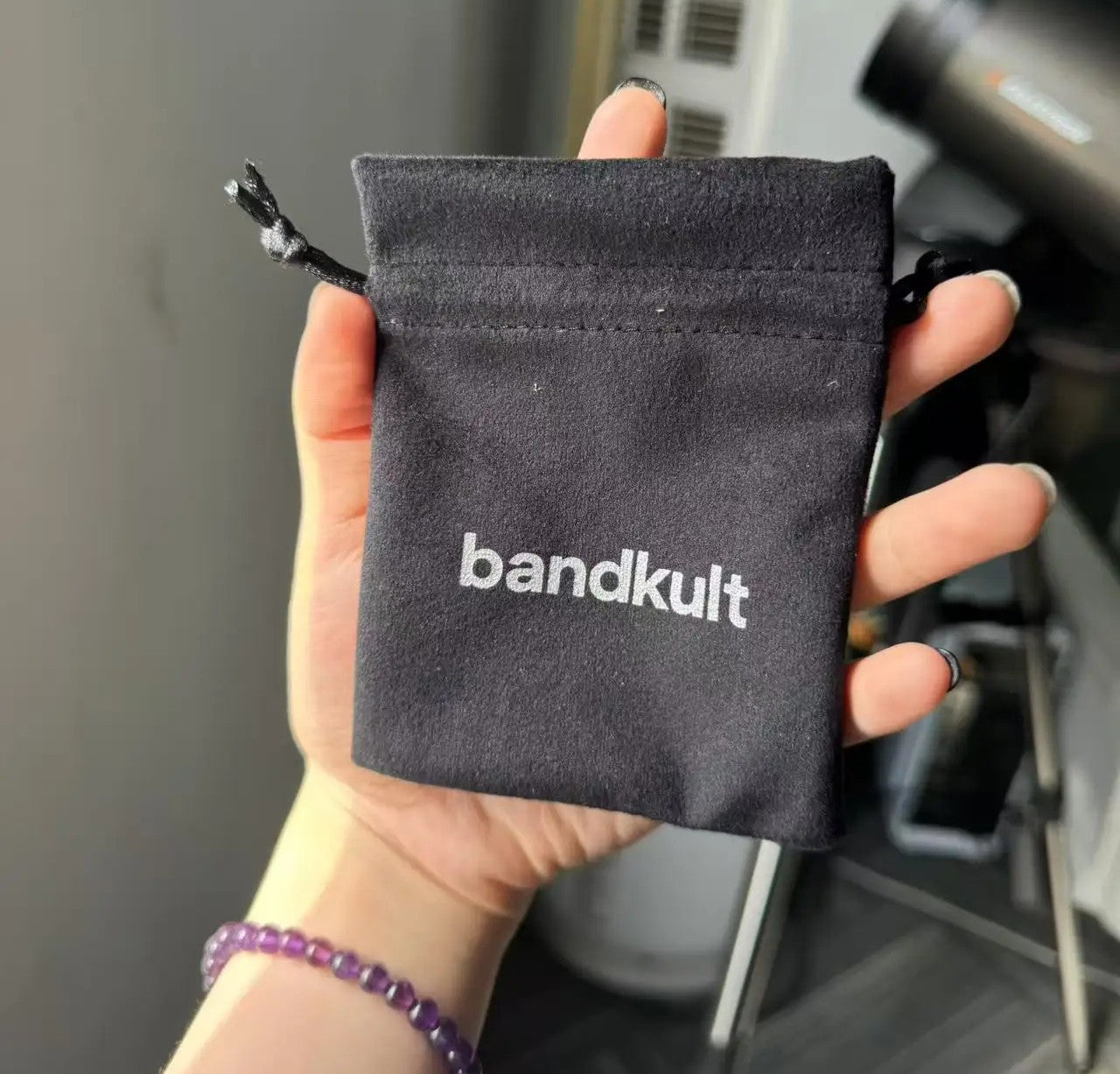 Auf dem Bild sieht man ein edles, schwarzes Stoffsäckchen mit dem minimalistischen Aufdruck „bandkult“ – schlicht, stilvoll und hochwertig. Jede Hülle kommt mit so einer hübschen Verpackung!
